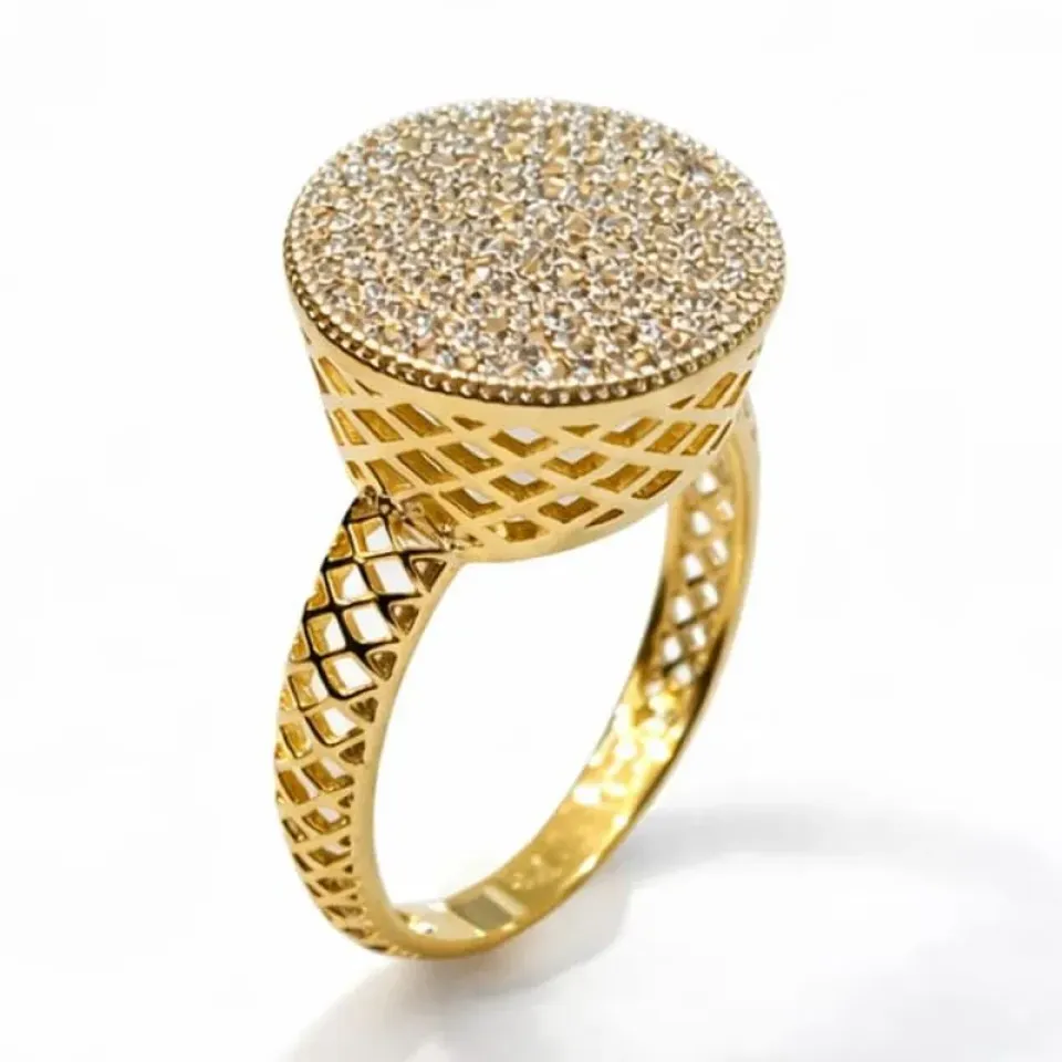 Imponente e sofisticado, este anel é a definição de brilho e elegância. Seu topo redondo totalmente cravejado com microzircônias cria um efeito luminoso intenso, enquanto a base trabalhada em detalhes vazados traz leveza e um toque moderno à peça.