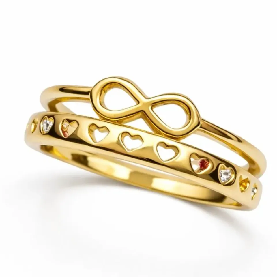 Cheio de significado e delicadeza, o Anel Duplo Infinito com Corações é a união perfeita entre romantismo e estilo moderno. O aro superior traz o símbolo do infinito, representando amor eterno e conexões que não têm fim. Já o aro inferior é adornado com delicados corações vazados, criando um visual encantador e feminino.