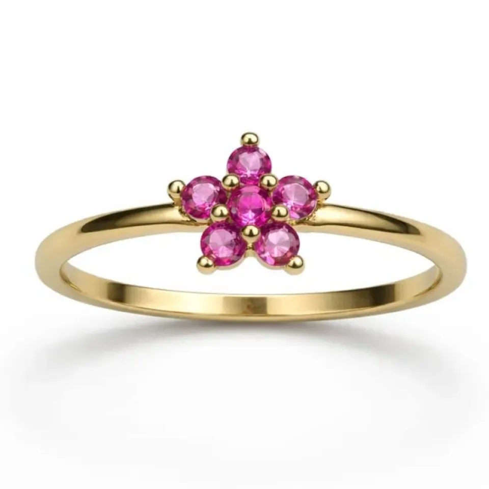 Delicado e cheio de charme, esse anel traz um design encantador em formato de flor, perfeito para quem ama peças femininas e sofisticadas. Suas pedras na cor rosa formam uma composição harmoniosa, criando um visual romântico e elegante.