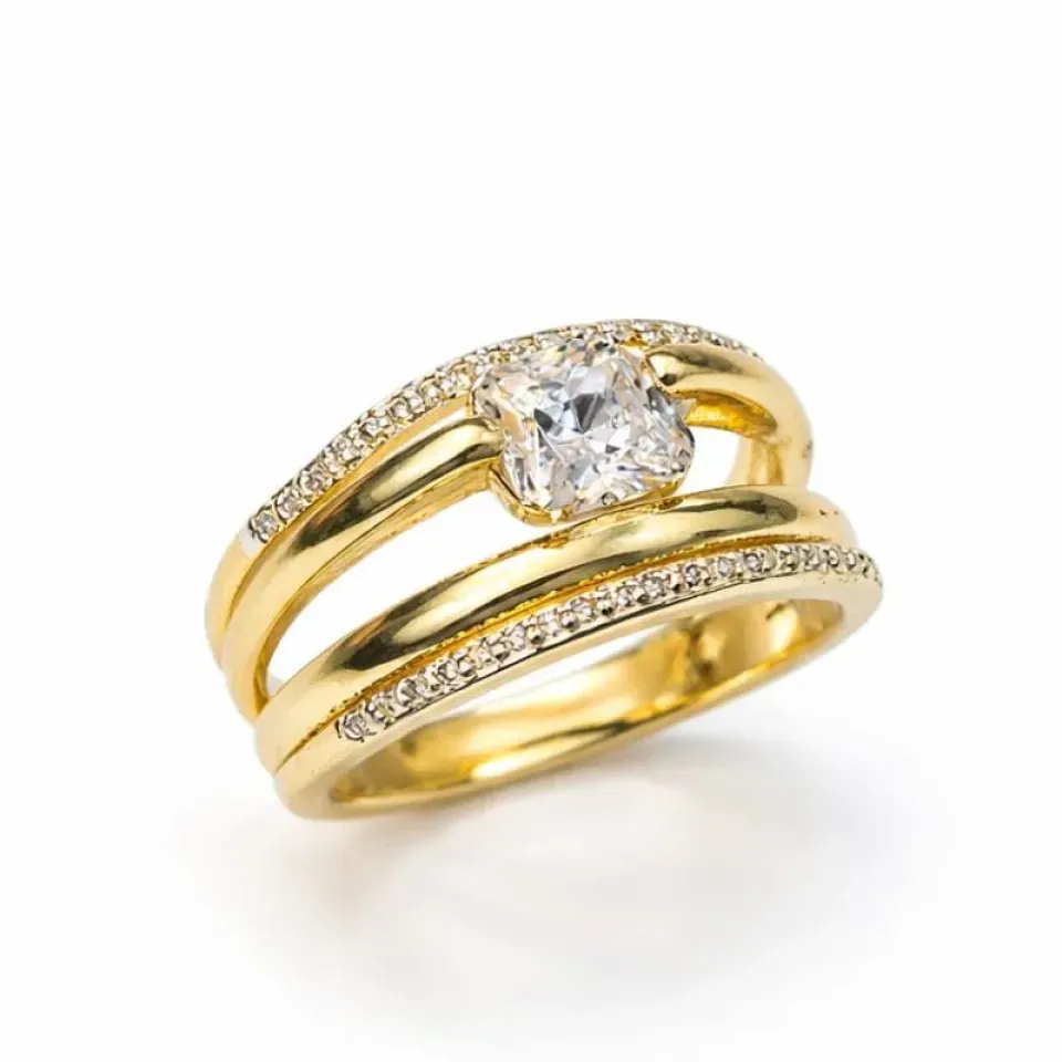 Um anel elegante e sofisticado que combina brilho e delicadeza em um único design. Possui pedra central em destaque que reflete a luz com intensidade, acompanhada por detalhes cravejados que valorizam ainda mais a peça.