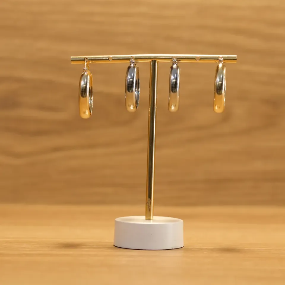 Adicione um toque de sofisticada modernidade ao seu visual com a dupla de argola oval dourado e ródio. Esta peça inovadora combina dois acabamentos elegantes em um design ousado e contemporâneo, oferecendo um acessório que é ao mesmo tempo estiloso e versátil.