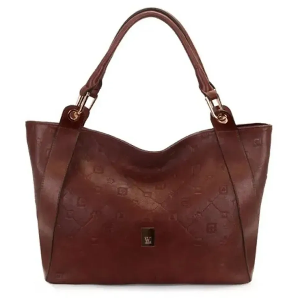 Elegante e versátil, a *Bolsa Satchel Grande Monograma WJ* na cor *marrom café* é ideal para compor looks sofisticados no dia a dia. Seu design estruturado com acabamento monograma e metais dourados traz um toque moderno e atemporal.