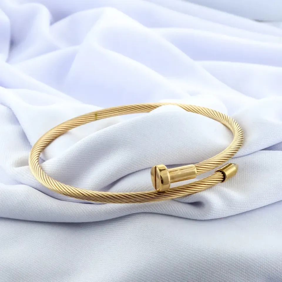 Adicione um toque de modernidade e elegância ao seu estilo com o bracelete prego de aço banhado em ouro rosé. Este acessório sofisticado combina um design contemporâneo inspirado na forma icônica de um prego, oferecendo um visual inovador e audacioso. O banho de ouro rosé confere um brilho suave e quente, criando um contraste elegante com a sua pele e adicionando um toque de luxo ao seu look. Com sua construção robusta e detalhes refinados, este bracelete é a peça perfeita para quem deseja um acessório que una design arrojado e classe. Versátil e estiloso, é ideal para qualquer ocasião, desde eventos especiais até o uso diário.