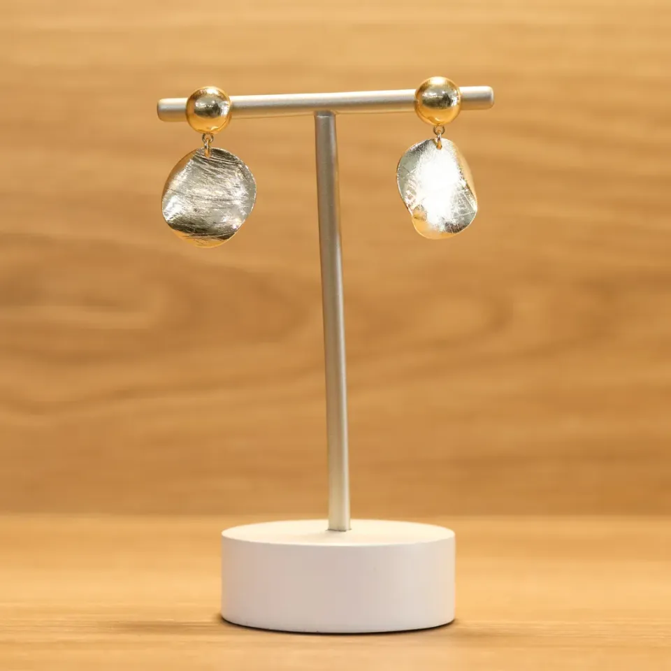 Este brinco combina elegância e originalidade com um design ousado e sofisticado. A peça apresenta uma bola arredondada, confeccionada em metal de alta qualidade, que se destaca pelo seu acabamento brilhante e sua estrutura sólida. O diferencial está na chapa amassada que compõe a bola, proporcionando uma textura única e um visual moderno e dinâmico.