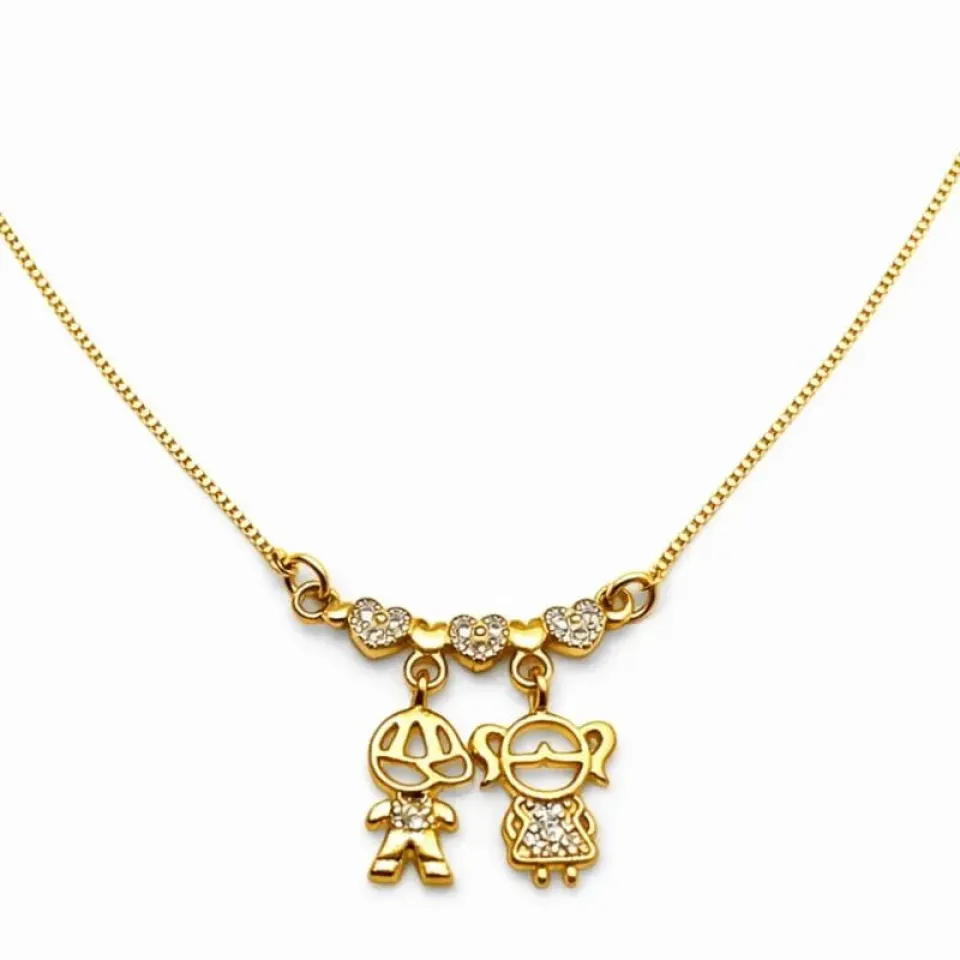 Um colar delicado e cheio de significado, perfeito para simbolizar o amor infinito de mãe. A peça possui detalhes em pequenos corações com zircônias e dois pingentes encantadores representando menino e menina, trazendo ainda mais emoção e brilho à semijoia.