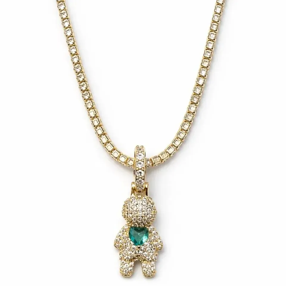 O destaque fica por conta do pingente de boneco totalmente cravejado com micro zircônias, trazendo ainda mais brilho e delicadeza. No peito do boneco há um coração em cristal verde água, que adiciona um toque especial e cheio de charme à peça.