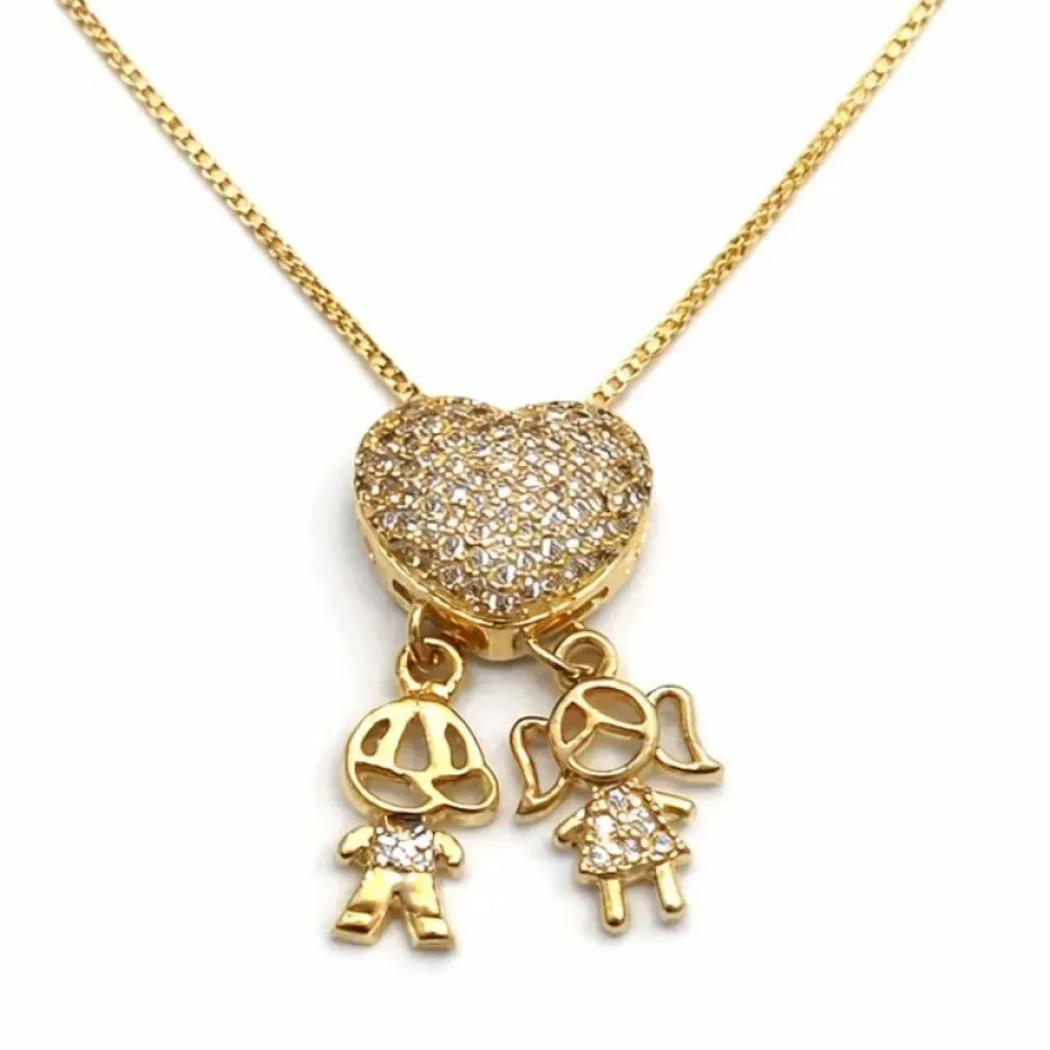 Abaixo do coração, dois pingentes simbolizam um menino e uma menina, representando os filhos de forma carinhosa e especial. Um colar elegante e afetivo, ideal para carregar sempre perto do coração quem você mais ama.