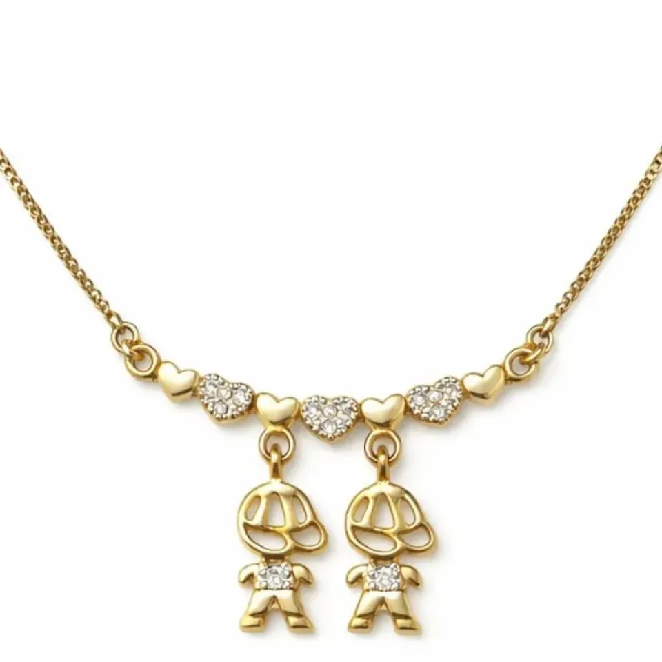 Um colar delicado e cheio de significado, perfeito para representar o amor entre mãe e filhos. A peça possui uma base com corações intercalados lisos e cravejados em zircônias, trazendo brilho e elegância ao design. No centro, dois pingentes de meninos, simbolizando o amor e o vínculo especial entre mãe e seus filhos.