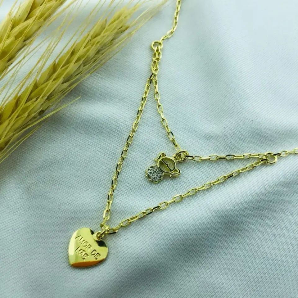 Este colar dourado duplo é uma peça elegante e cheia de significado. Ele apresenta uma corrente fina e delicada, que confere um toque suave e sofisticado ao visual. O primeiro pingente é um coração, gravado com a frase "Amor de Mãe", expressando todo o carinho e a conexão profunda entre mãe e filho. O segundo pingente é uma silhueta que simboliza um filho, cravejada com zircônias brilhantes, trazendo um toque de brilho e delicadeza à peça. Essa combinação de pingentes torna o colar uma homenagem especial ao amor incondicional de uma mãe. Ideal para quem deseja carregar sempre consigo o vínculo com seus filhos de forma elegante e cheia de emoção.