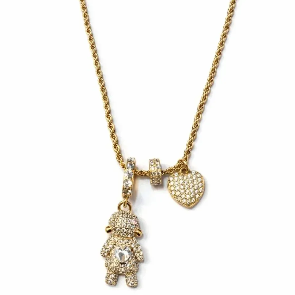 O destaque fica por conta do pingente de boneca totalmente cravejado com micro zircônias, com um coração em cristal no peito, que traz ainda mais charme e luminosidade à peça. O colar também acompanha berloques cravejados e um pingente de coração cravejado, deixando o conjunto ainda mais especial.