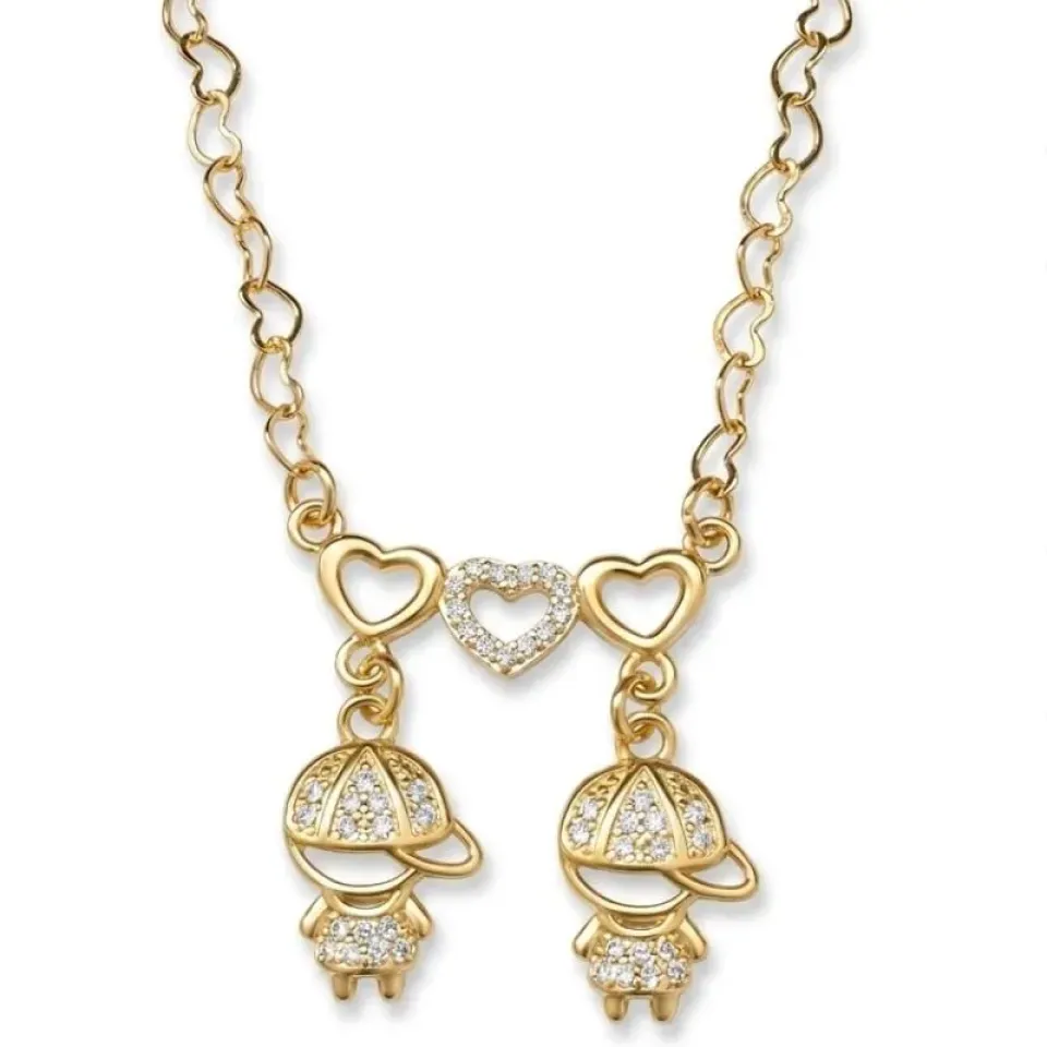 Com dois pingentes de menino e detalhes em zircônias, a peça representa o amor entre mãe e filhos com muito brilho e elegância.