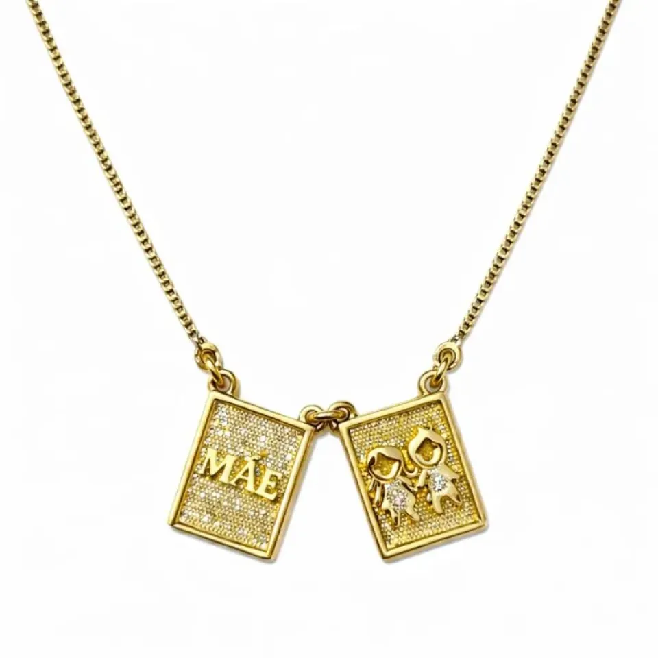 Um colar delicado e cheio de significado, perfeito para representar o amor entre mãe e filhos. A peça possui dois pingentes quadrados: um com a palavra “MÃE” em destaque e outro com o desenho vazado de um menino e uma menina, simbolizando a união e o amor da família.