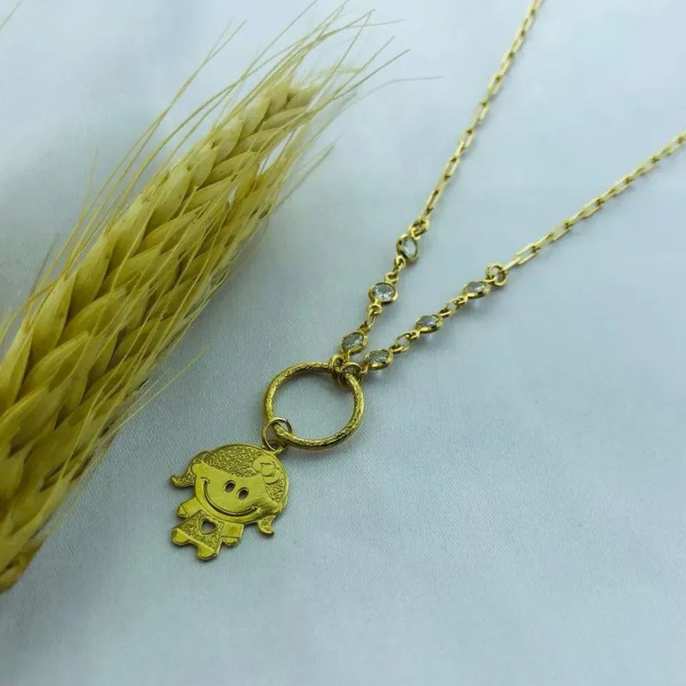 Este colar delicado apresenta uma corrente adornada com pontos de luz, que adicionam um brilho suave e elegante ao visual. O destaque da peça é o pingente, representando uma filha, cuidadosamente elaborado para simbolizar o amor e a conexão única entre mãe e filha.