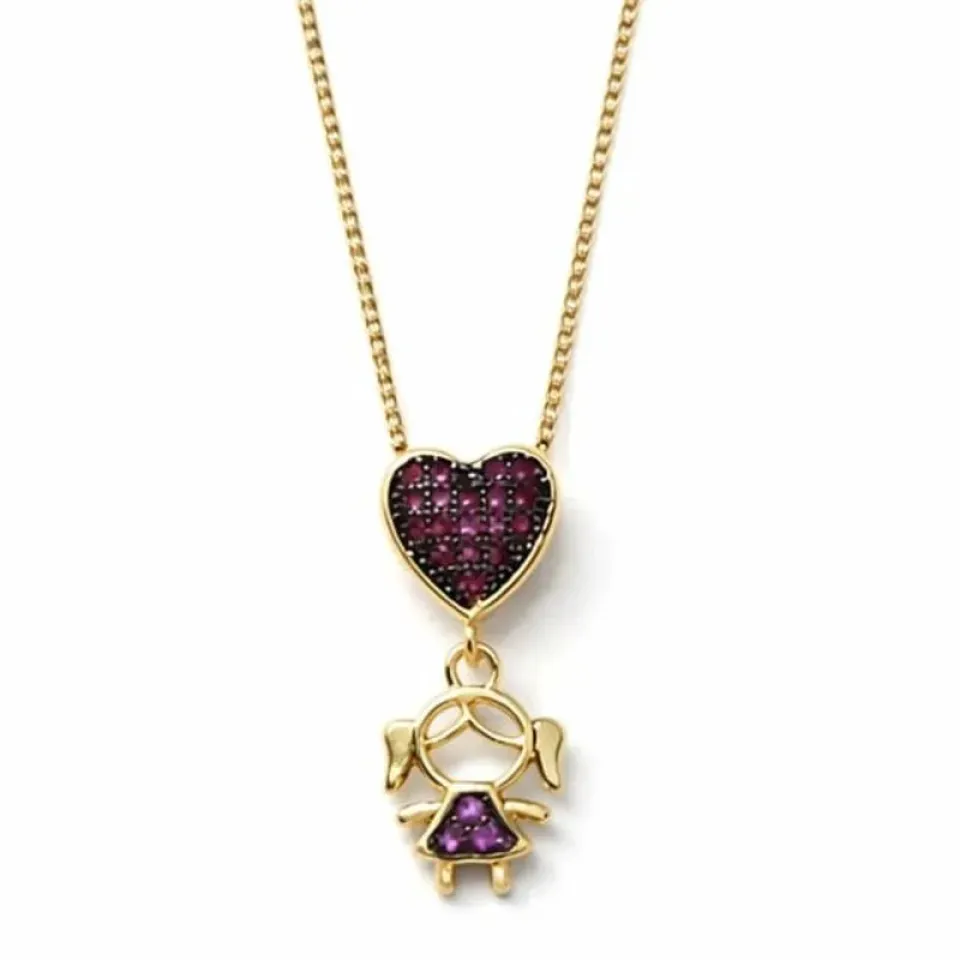 Um colar delicado, romântico e cheio de significado. A peça traz um lindo coração cravejado em tom rosa/roxo que se conecta a um charmoso pingente de menina, formando uma composição afetiva e muito feminina.