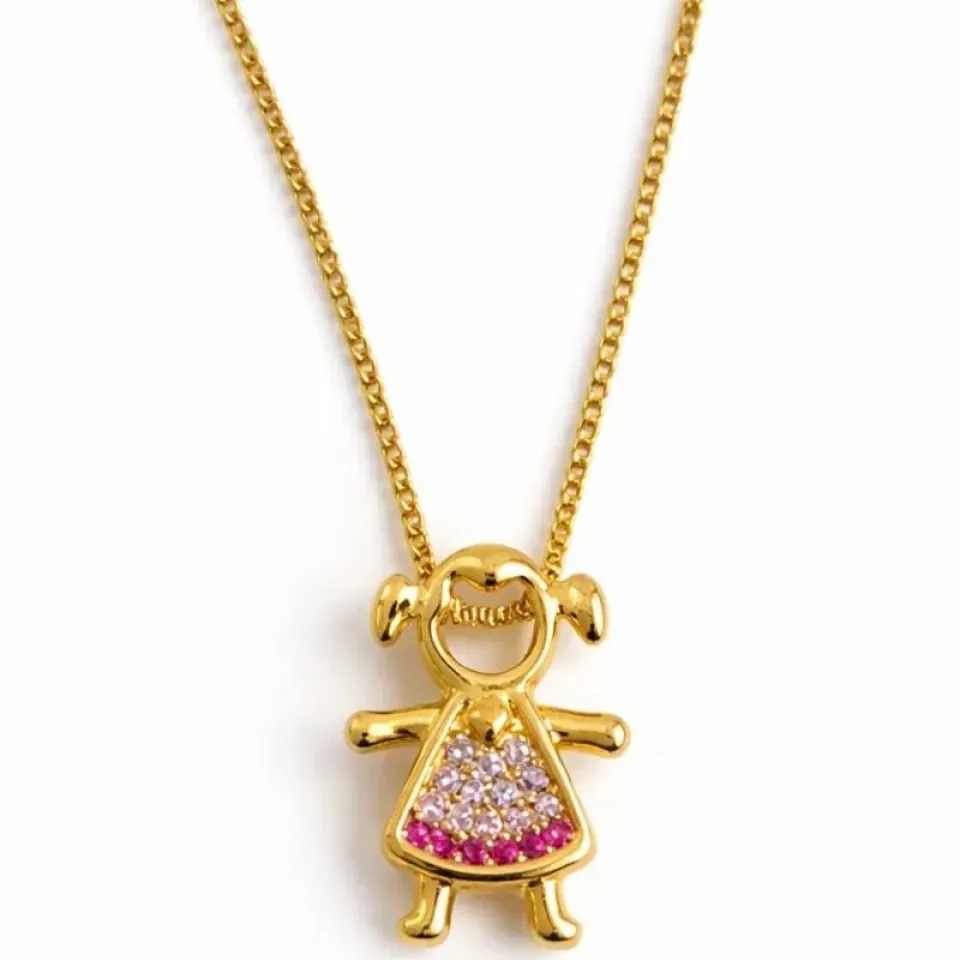 Delicado, encantador e cheio de significado. O colar possui um pingente em formato de menina com detalhes cravejados em zircônias brancas e rosa, trazendo brilho, feminilidade e um toque especial à peça.