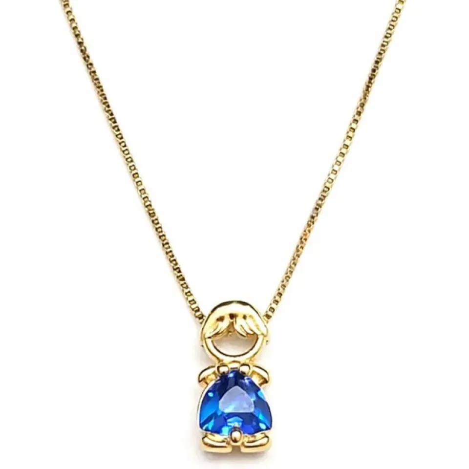 Um colar delicado e cheio de significado, perfeito para representar o amor entre mãe e filho. A peça possui um lindo pingente em formato de menino, com detalhe em pedra azul em formato de coração invertido, que traz brilho e um toque especial à semijoia.
