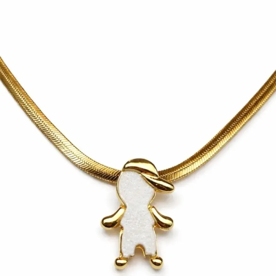 A peça possui corrente estilo malha, que traz um visual moderno, elegante e muito sofisticado. O destaque fica por conta do pingente de menino, um símbolo de carinho, proteção e da conexão única entre mãe e filho.