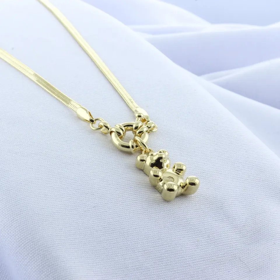 Este colar combina a elegância de uma corrente de fita com a fofura de um pingente de urso, criando uma peça charmosa e sofisticada. A corrente de fita, com seu design suave e contínuo, complementa perfeitamente o pingente de urso, que adiciona um toque de personalidade e ternura ao conjunto.
