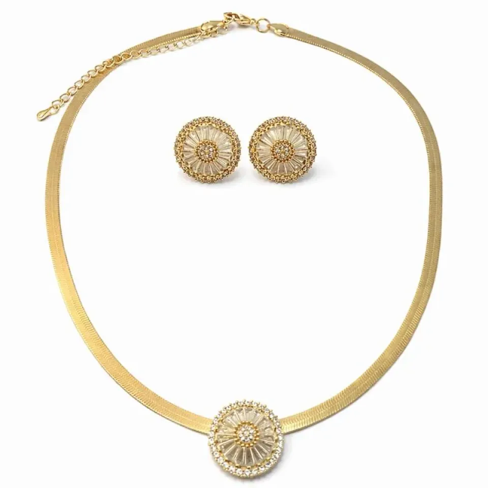 Um conjunto sofisticado e cheio de brilho para mulheres que amam elegância e destaque. Composto por colar de malha lisa estilo fita e brincos combinando, o design traz um lindo detalhe circular cravejado que reflete a luz de forma delicada e encantadora.