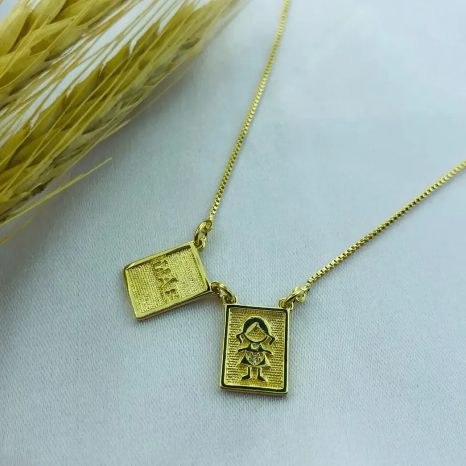 Este escapulário dourado banhado a ouro 18k é uma peça refinada e cheia de significado. Ele apresenta dois pingentes distintos: um com o delicado formato de "filho", simbolizando o amor e a proteção, e outro com a palavra "Mãe", expressando a conexão eterna e o carinho incondicional entre mãe e filho.
