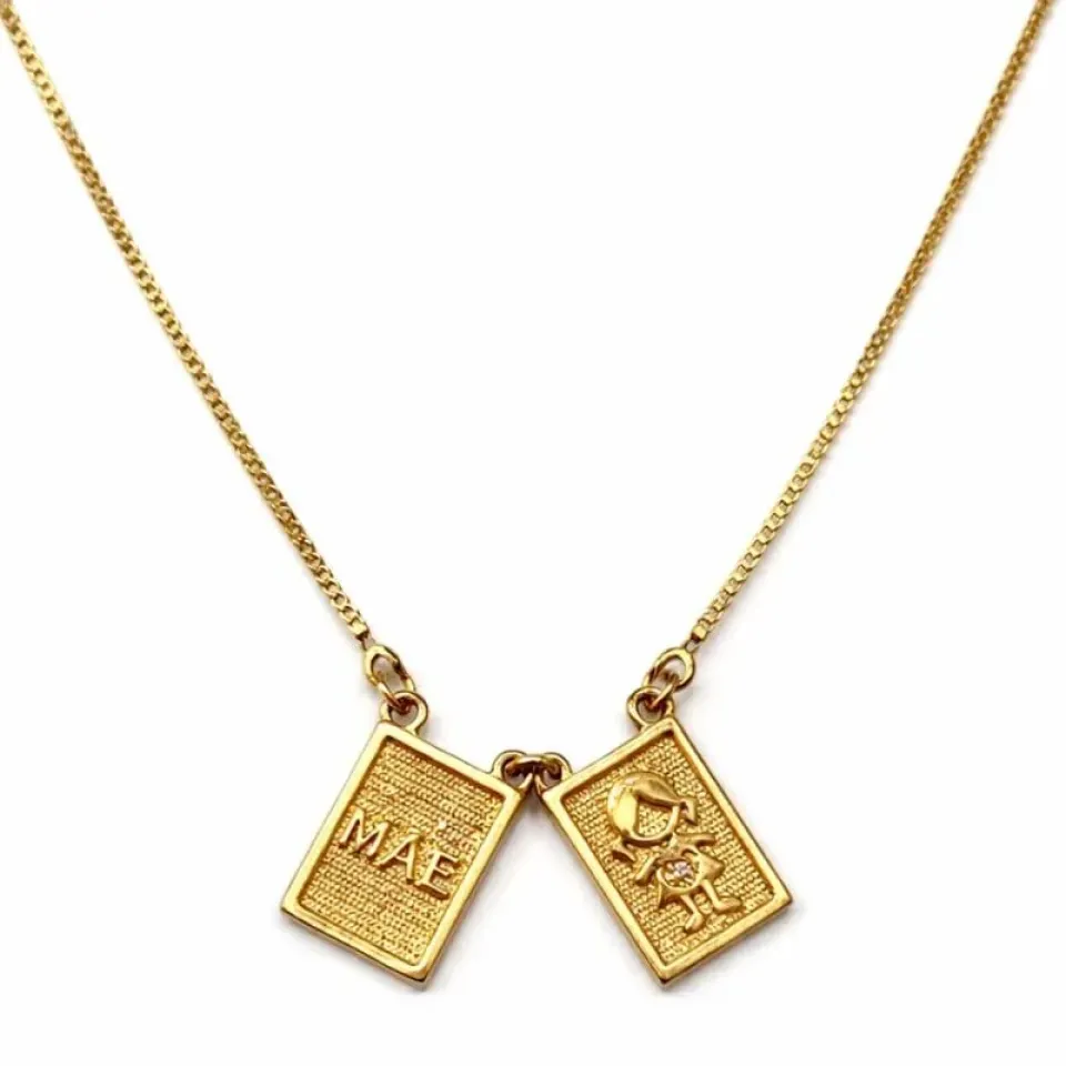 Delicado e cheio de significado, o colar Mãe é uma joia especial que representa o amor eterno entre mãe e filha. A peça possui dois pingentes retangulares: um com a palavra “MÃE” em destaque e outro com o desenho de mãe e filha (menina) com um coração, simbolizando carinho, proteção e um vínculo para toda a vida.