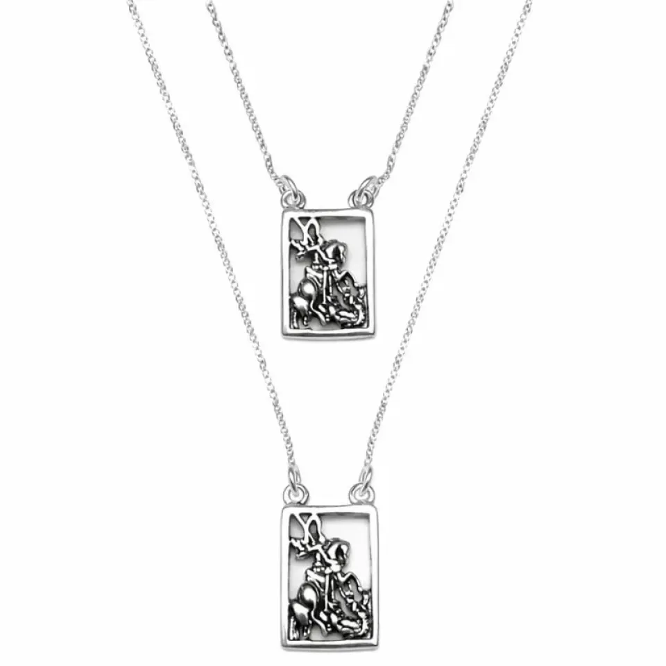 O escapulário em prata 925 traz dois pingentes com o desenho de São Jorge, representando coragem, vitória e proteção espiritual. Com acabamento em prata clara e polida, a peça possui um brilho elegante e sofisticado, ideal para quem deseja carregar sua fé com estilo.