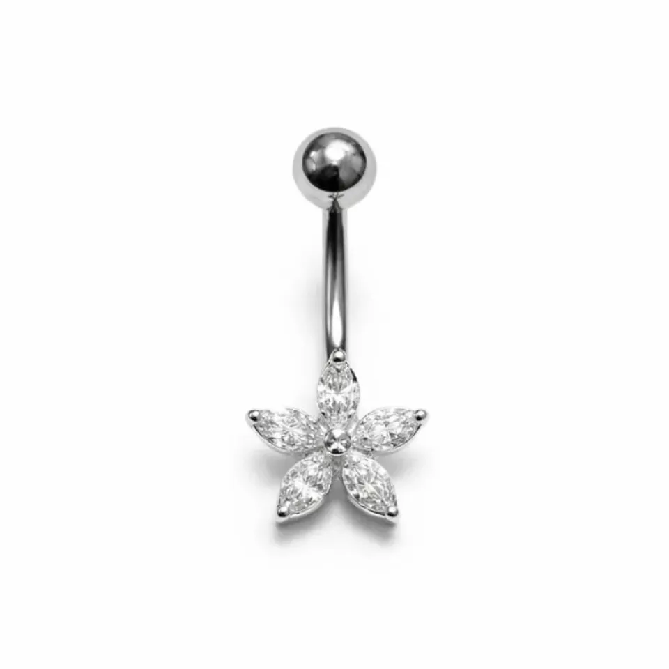 Delicado e elegante, o piercing para umbigo em AÇO é a escolha perfeita para quem busca um toque de brilho com sofisticação. Seu design em formato de flor traz um charme especial, valorizando ainda mais a peça e destacando sua beleza de forma sutil e feminina.
