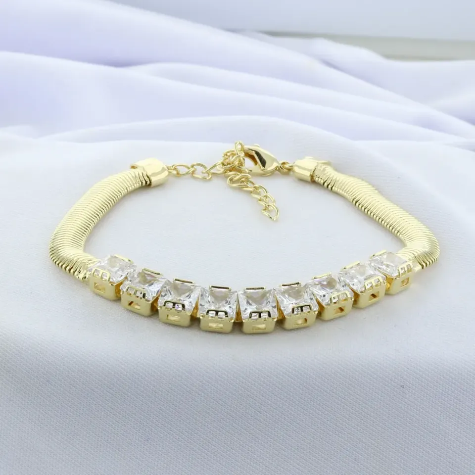 A pulseira Lacraia é uma peça de joalheria deslumbrante, projetada para adicionar um toque de glamour e sofisticação ao seu estilo. Combinando pedras de zircônia e cristais, esta pulseira oferece um brilho intenso e uma aparência luxuosa.
